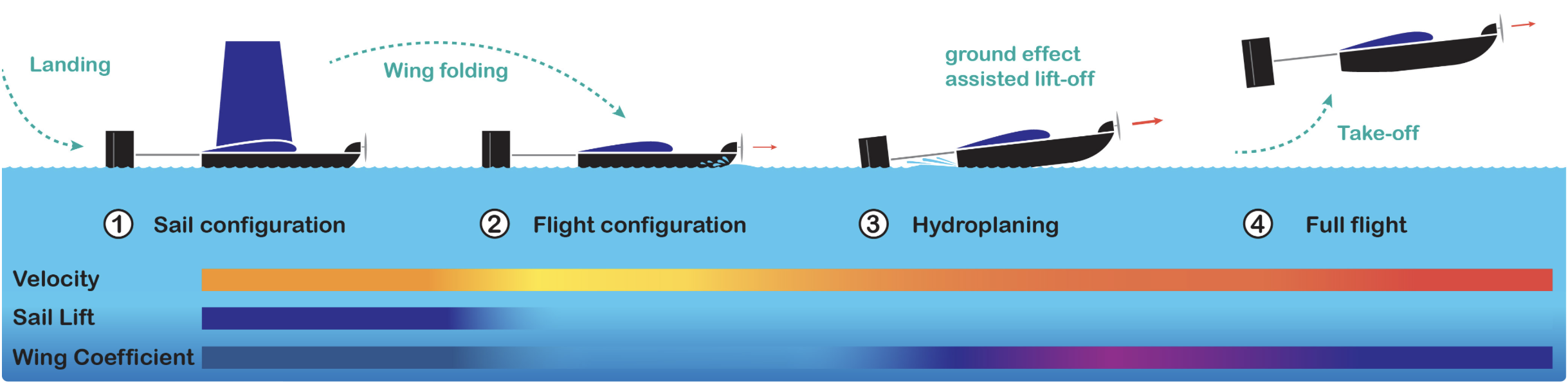 Sailing-Flight Cycle Overview: The robot lands on water, transitions to a sailing configuration, and carries out its mission. Takeoff is achieved through propelled acceleration, progressing from displacement mode to hydroplaning and finally becoming fully airborne.