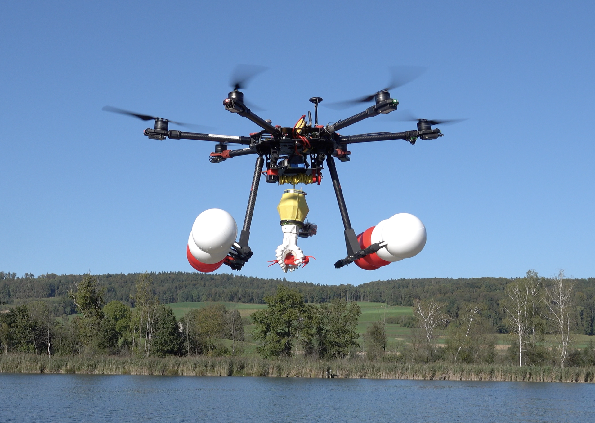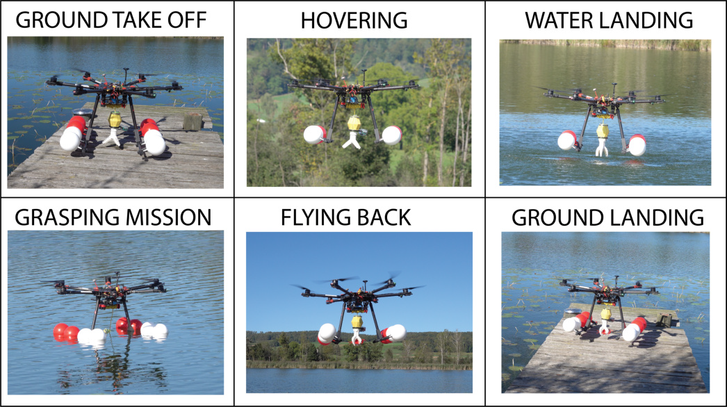 The reliability of the submarine pod was tested in a water tank by tracking its attitude and energy consumption during grasping maneuvers. The system also accomplished a successful mission in a lake, where it was deployed on a hexacopter. Overall, the integration of this system expands the operational capabilities of underwater grasping, makes grasping missions more efficient and easy to automate, as well as causing less disturbance to the water ecosystem.